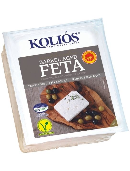 KOLIOS authentic Barrel Aged Feta, витримана в дерев'яних бочках, виготовляється зі свіжого пастеризованого овечого та козячого молока тварин, які пасуться на вільному випасі, за традиційним рецептом. Природний аромат середземноморських трав у поєднанні з ароматом деревини надає сиру KOLIOS Barrel Aged Feta унікальний насичений смак, який отримав нагороди.