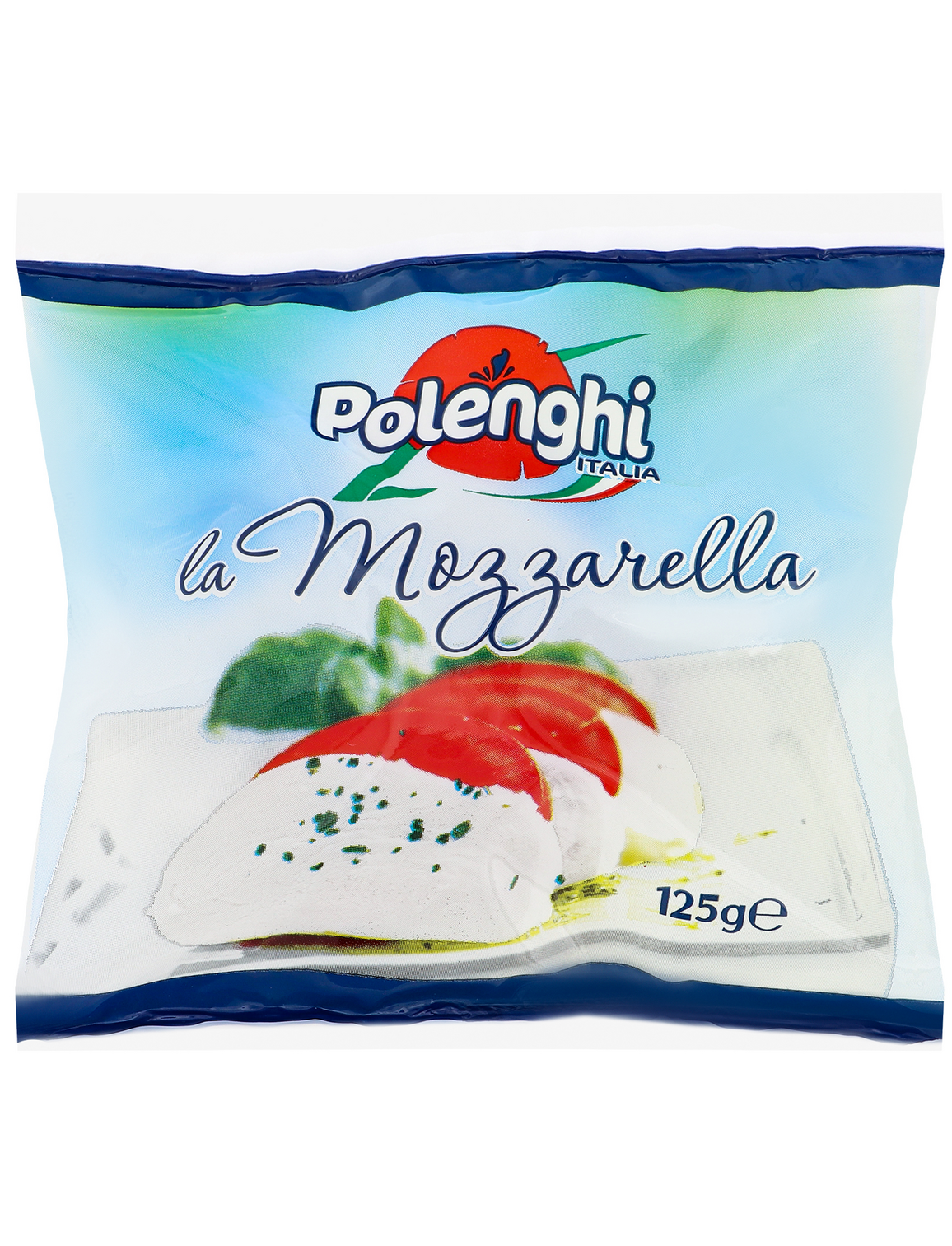 Сир Polenghi Mozzarella м`який 45% 125г. Склад: молоко, сіль, мікробний сичужний фермент, молочні ферменти.