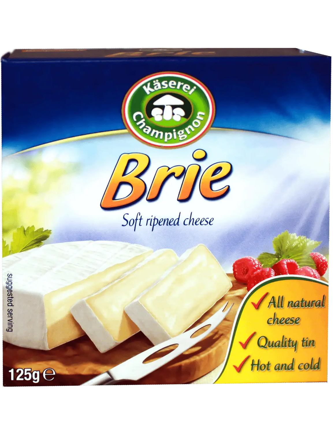 Сир Kaserei Schampignon Брі 50% 125г. Жирність 50% у сухій речовині. Склад: пастеризоване молоко, сіль, мікробіологічний сичужний фермент, молочнокислі культури, культури для дозрівання.