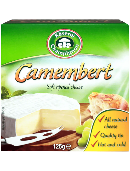 Сир Kaserei Schampignon Камамбер 50% 125г. Жирність 50% у сухій речовині. Склад: пастеризоване молоко, сіль, мікробіологічний сичужний фермент, молочнокислі культури, культури для дозрівання.