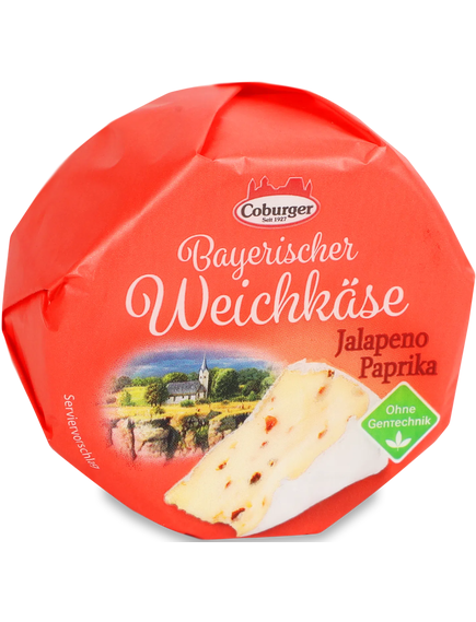 Пряний, ароматний м'який сир, покритий цвіллю камамбер. Рівномірно доповнений перцем і халапеньо. Виготовляється з найкращого баварського молока.Без лактози завдяки природному дозріванню.