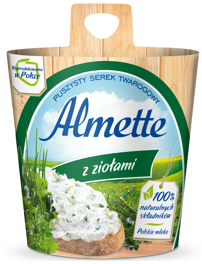 Cвіжий вершковий сир Almette - це незвичайне поєднання свіжого ніжно збитого творожного сиру з дивовижним розмаїттям натуральних смаків. Сир Almette ідеально поєднується з різними продуктами. Творожний сир продається в оригінальних контейнерах по 150 грам у вигляді дерев'яного відерця. Герметично запаяна фольга легко відкривається завдяки «язичку», для подальшого зберігання контейнер накритий прозорою кришкою.