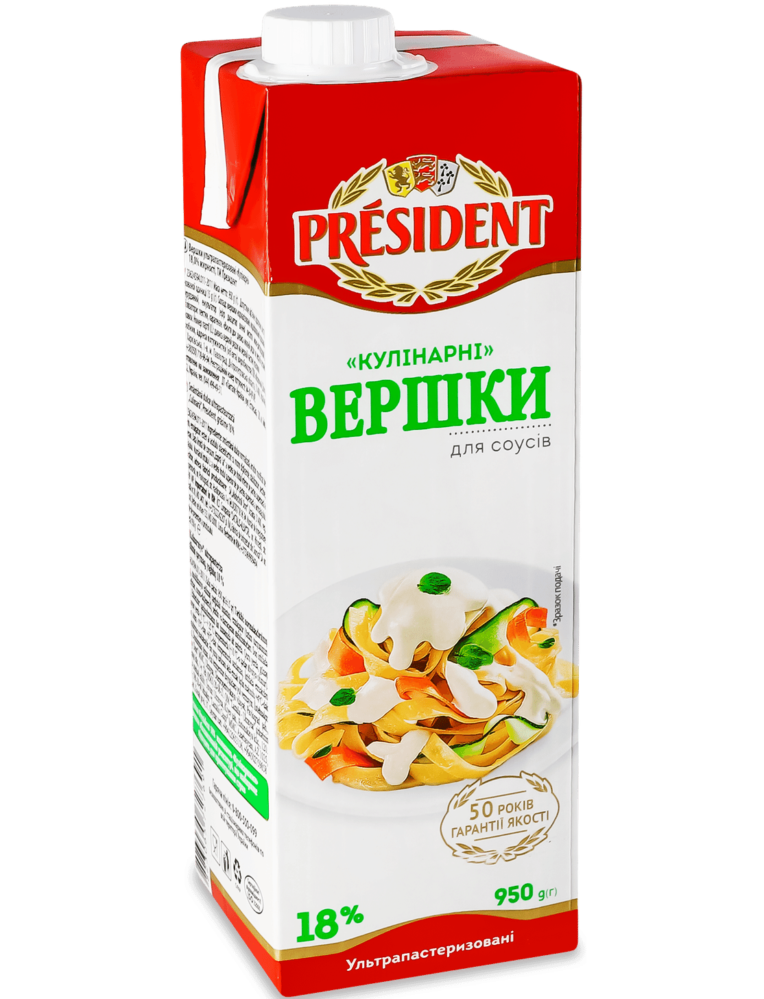 Кулінарні вершки тривалого зберігання, виготовлені за спеціальною технологією та рецептурою, розробленою французькими технологами, у тісній співпраці із французькими шеф-поварами. Бренд надає продукт, розрахований як для домашнього та для професійного використання. Вершки TM «President» додадуть неперевершено вишукану вершкову ноту Вашим стравам!