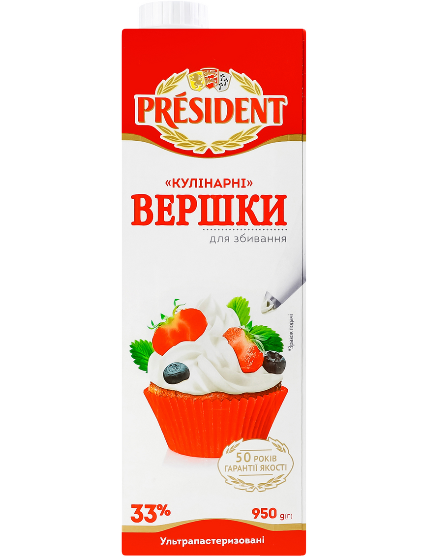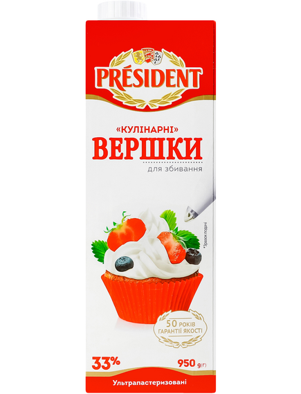 Кулінарні вершки тривалого зберігання, виготовлені за спеціальною технологією та рецептурою, розробленою французькими технологами, у тісній співпраці із французькими шеф-поварами. Бренд надає продукт, розрахований як для домашнього та для професійного використання. Вершки TM «President» додадуть неперевершено вишукану вершкову ноту Вашим стравам!