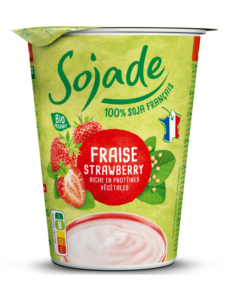 Полуничний рослинний йогурт, виготовлений з органічної французької сої, є джерелом рослинного білка. Цей смачний і корисний продукт можна вживати в будь-який час доби. Містить 9% полуниці.