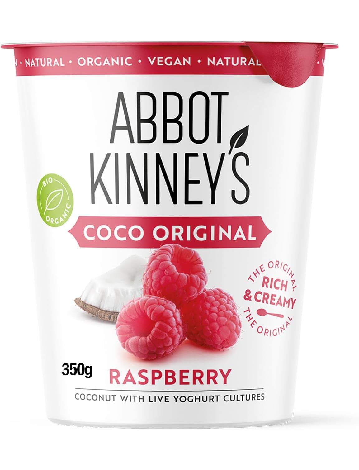 Abbot Kinney's органічний веганський йогурт з ферментованого кокосу "Coco Original Малина" об'ємом 350 г — це смачний та корисний продукт на рослинній основі, який поєднує ніжний смак кокосу з освіжаючою малиною.