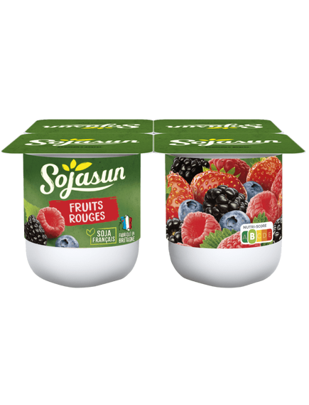 Склад: соєвий сік 78% (вода, соєві боби* 9%), червоні фрукти 10% (чорниця, полуниця, ожина, малина), цукор, рисовий крохмаль, солі кальцію, загусники: борошно з насіння ріжкового дерева – пектин, натуральний ароматизатор, концентрований лимонний сік, вибраних заквасок.