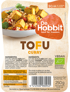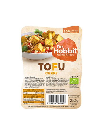 Склад: 91% тофу* (варені СОЄВІ БОБИ*, вода), 5% каррі* (ГІРЧИЦЯ*, трави та спеції*), куркума*, коріандр*, паприка*, сіль. (*=Органічне сільське господарство). Може містити сліди глютену, горіхів, селери та кунжуту.