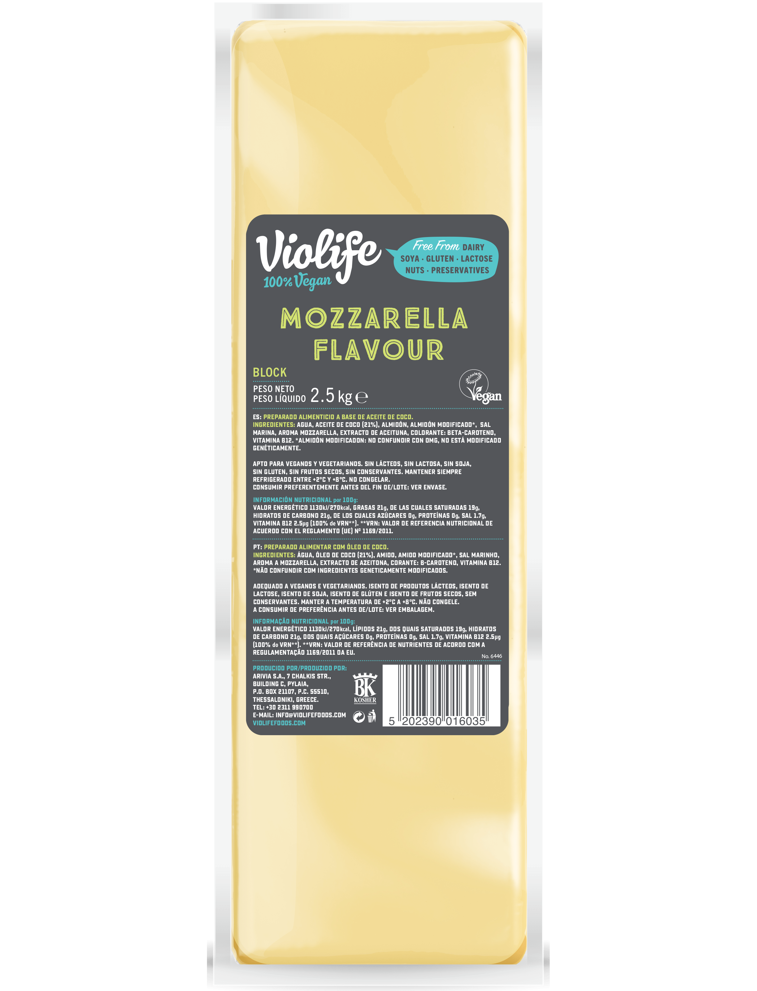 Склад: вода, кокосова олія (23%), модифікований крохмаль *, крохмаль, морська сіль, ароматизатор моцарела, екстракт оливкової олії, колір: B-каротин, вітамін B12. Хто не любить еластичні, плавні якості моцарели? Ну, це те, що ми відтворили тут на 100%. Нехай вона розтане на вашій піці, і...