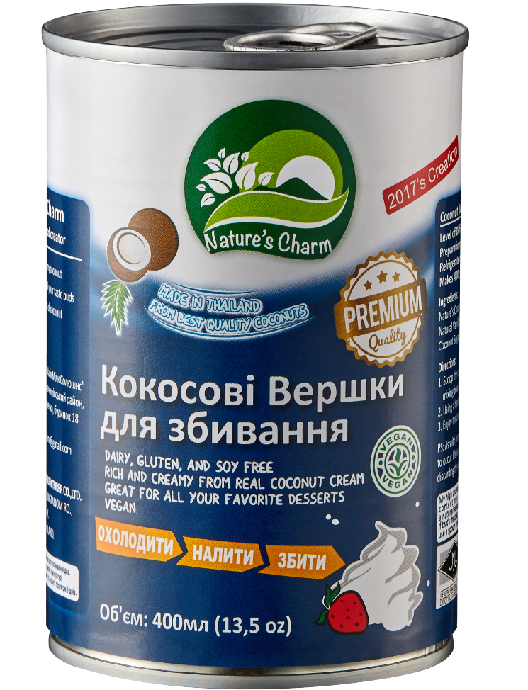 Вершки Nature's Charm Coconut Whipping Cream виготовляються в Таїланді з кокосових горіхів найкращої якості. Кокосові вершки Nature's Charm для збивання насичені та кремові зі справжніх кокосових вершків, що робить їх чудовими для всіх ваших улюблених десертів.