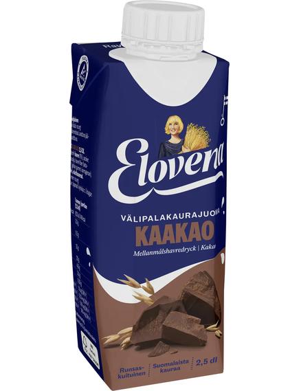 М’який смаковий напій Elovena з какао – це напій рослинного походження з високим вмістом клітковини, який містить кальцій і вітамін D. Продукт виготовлений у Фінляндії з фінського вівса. Не містить глютену.