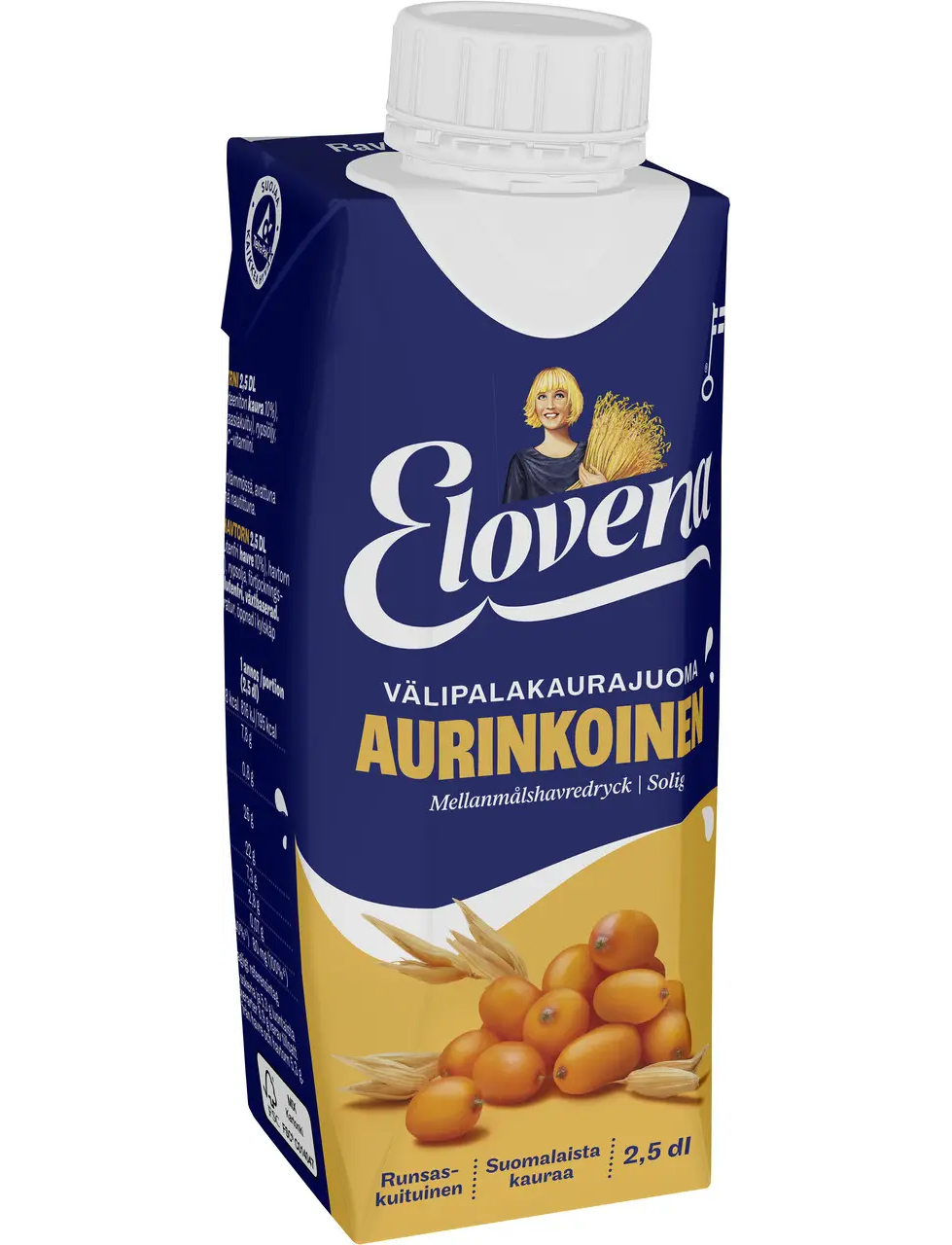 Напій Elovena sunny з м’яким смаком – це напій на рослинній основі з високим вмістом клітковини, який містить вітамін С. Продукт виготовлений у Фінляндії з фінського вівса. Не містить глютену.