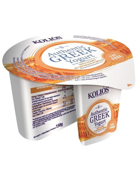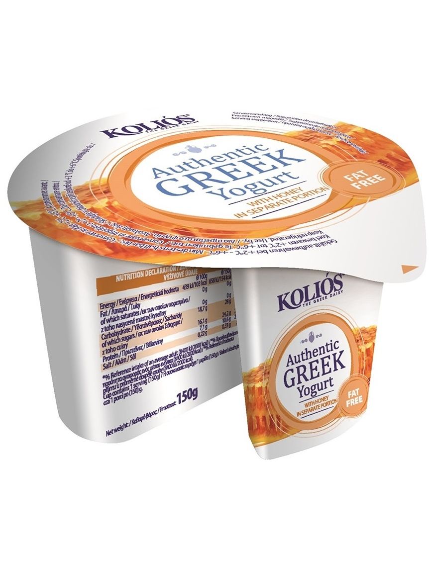 KOLIOS Автентичний ГРЕЦЬКИЙ ЙОГУРТ 0% жирності, виготовлений із знежиреного коров'ячого молока та додаванням меду в окремій порції. Версія типового густого грецького зцідженого йогурту 0% жирності зі смачною кремовою консистенцією та солодким медом.