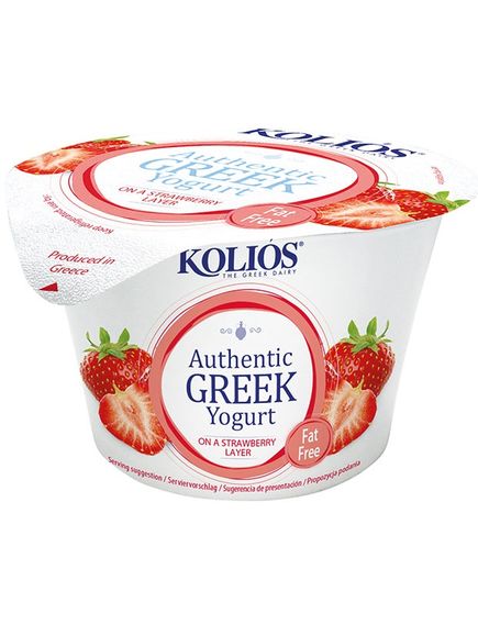 Ваш улюблений Автентичний ГРЕЦЬКИЙ зціджений йогурт KOLIOS 0% жирності на смачній фруктовій прошарку.