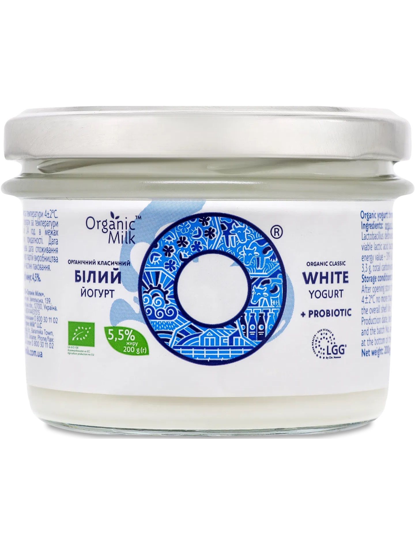 Склад: молоко коров'яче органічне нормалізоване, закваска для йогурту (Streptococcuc termophilus, Lactobacillus delbrueckii subsp., Bulgaricus), пробіотик: Lactobacillus rhamnosus (LGG). Кількість життєздатних молочнокислих бактерій, КУО в 1см³ продукту не менше ніж 1х10⁹. Без ГМО.