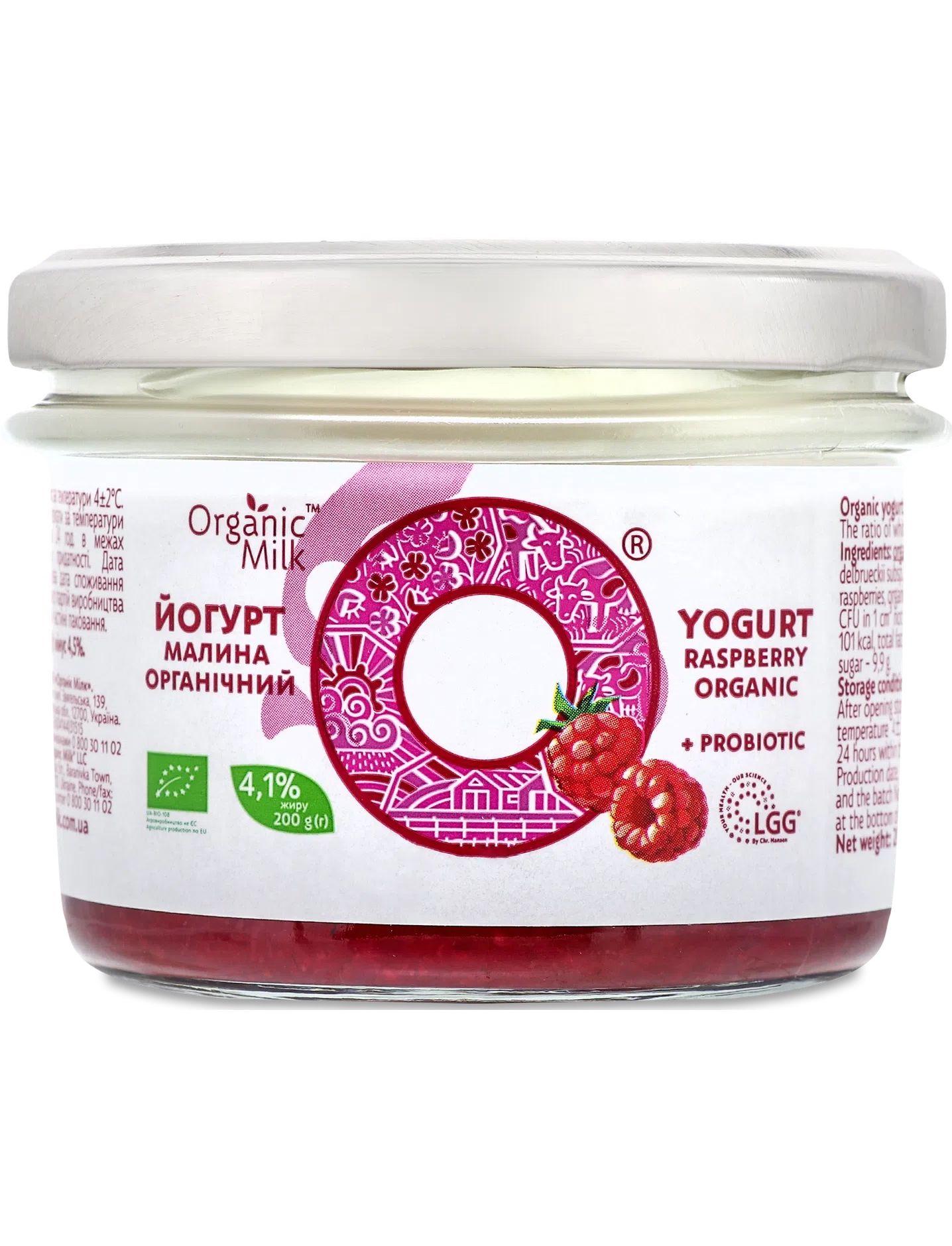 Співвідношення білого йогурту 75% та наповнювача "Малина" 25%. Склад: молоко коров'яче органічне нормалізоване, закваска для йогурту (Streptococcuc termophilus, Lactobacillus delbrueckii subsp.,Bulgaricus), пробіотик: Lactobacillus rhamnosus (LGG), наповнювач "Малина" - органічна малина заморожена, органічний цукор, пектин - загущувач, лимонна кислота - регулятор кислотності. Кількість життєздатних молочнокислих бактерій, КУО в 1см³ продукту не менше ніж 1х10⁹. Без ГМО.