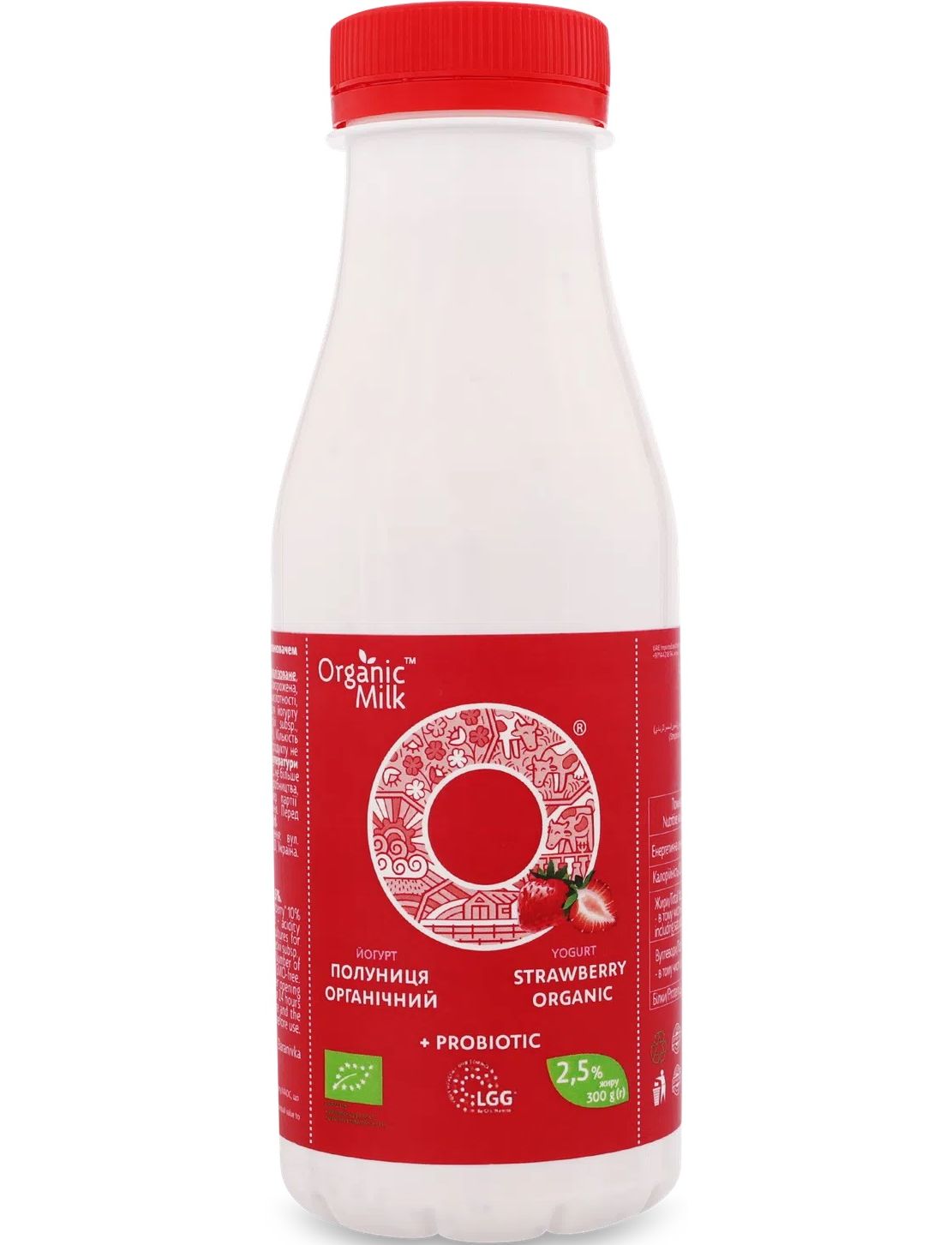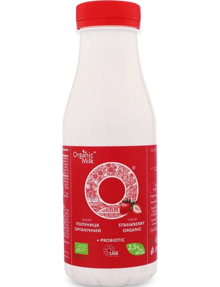 молоко коров'яче органічне нормалізоване, наповнювач "Полуниця" 10% (органічна полуниця заморожена, органічний цукор, лимонна кислота - регулятор кислотності, пектин - загущувач), цукор органічний, закваска для йогурту (Streptococcuc termophilus, Lactobacillus delbrueckii subsp.,Bulgaricus), пробіотик: Lactobacillus rhamnosus (LGG). Кількість життєздатних молочнокислих бактерій, КУО в 1см3 продукту не менше ніж 1х109. Без ГМО.