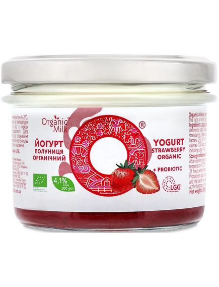 Співвідношення білого йогурту 75% та наповнювача "Полуниця" 25%. Склад: молоко коров'яче органічне нормалізоване, закваска для йогурту (Streptococcuc termophilus, Lactobacillus delbrueckii subsp.,Bulgaricus), пробіотик: Lactobacillus rhamnosus (LGG), наповнювач "Полуниця " - органічна полуниця заморожена, органічний цукор, пектин - загущувач, лимонна кислота - регулятор кислотності. Кількість життєздатних молочнокислих бактерій, КУО в 1см³ продукту не менше ніж 1х10⁹. Без ГМО.