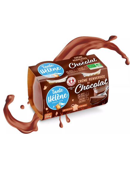 Тітка Елен пропонує вам свій чудовий перевернутий крем з цілими яйцями та шоколадом. Цей десерт надзвичайно смачний і виготовлений із органічного та місцевого молока, цукру та органічного та справедливої торгівлі какао.