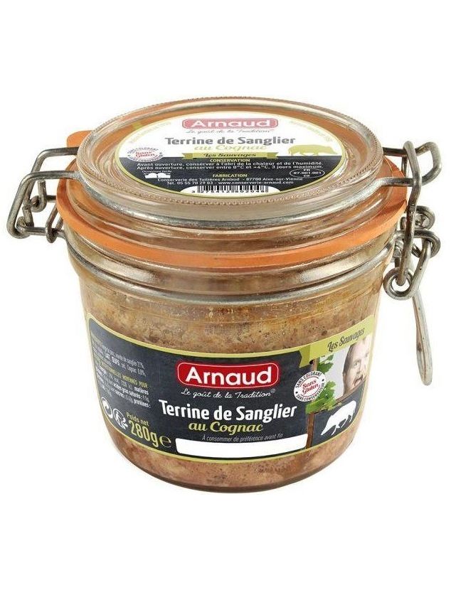 По-справжньому унікальний террін з дикого кабана від преміального французького виробника Arnaud у практичній баночці, що закривається. Насичений смак підсилив додавання коньяку. Ідеально підходить до тостів, крекерів або до хрусткого хліба.