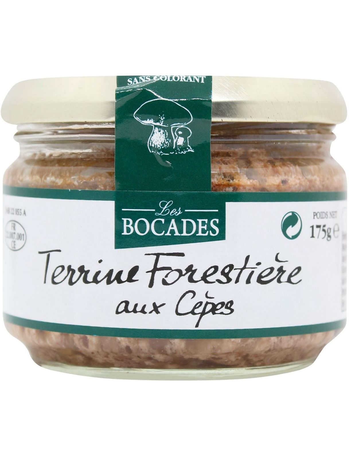 Склад: свинячий жир, свиняча печінка (30%), свиняче стегно, свиняча шкірка, регідратований лісовий гарнір 3,3% (жовті боровики 1,3%, білі гриби 1,2%, гливи 0,8%), борошно пшеничне, сіль, перець, цукор, часник, консервант: нітрит натрію. Містить яйце, глютен; може містити сліди молока, гірчиці, селери.