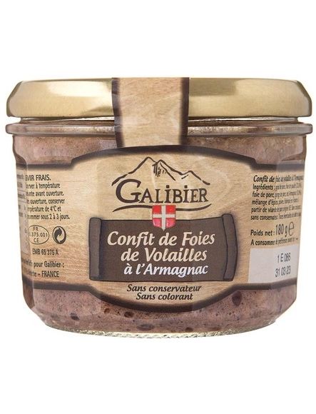 Склад: свинячий жир, куряча печінка 23,8%, свиняча печінка, свиняча груинка, сіль, арманьяк 0,9%, спеції, перець.