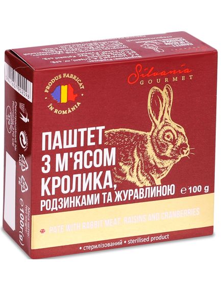 Склад: м'ясо кролика (30%) походження з ЄС, свинячий жир, вода, м’ясо свинини (20%) походження з ЄС, золотисті родзинки (6%), журавлина (6%), крохмаль, харчові волокна, рослинний білок, рисове борошно, сіль, натуральний ароматизатор (містить селеру), зневоднені овочі, спеції (чилі), глюкозний сироп, цукор (декстроза).