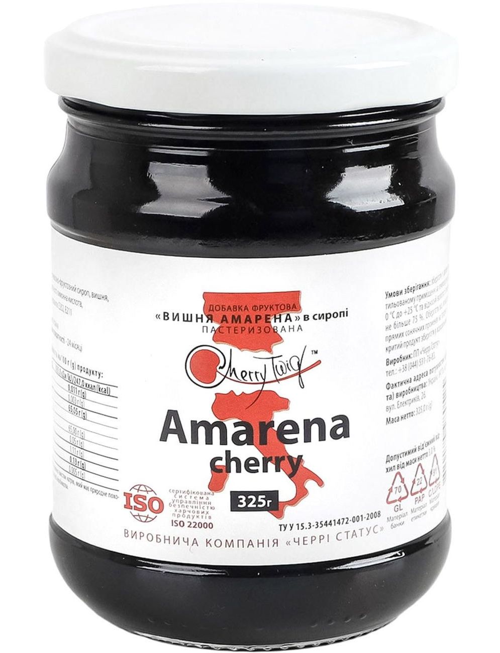 Склад: цукор та/або глюкозно-фруктозний сироп, вишня, вода, регулятор кислотності лимонна кислота, ароматизатори, консерванти: Е202, Е211.
