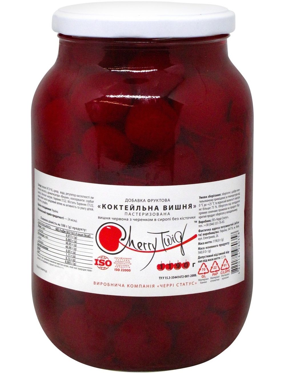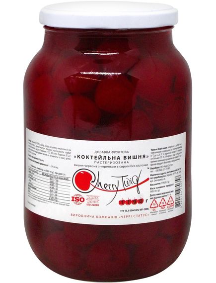 Склад: вишня, вода, цукор, сироп кукурудзяний, лимонна кислота, ароматизатор вишня ідентичний натуральному, барвник Е124, сорбат калію менше 0,05%.