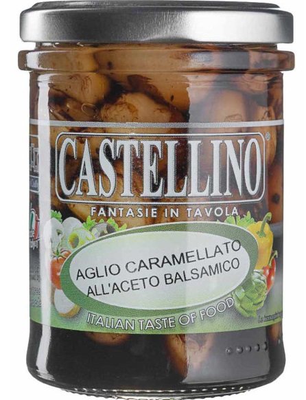 Склад: смажені зубчики часнику, цукор, бальзамічний очет з Модени IGP 10% (винний оцет, концентрований виноградний сік, барвник Е150d (цукровий колер), вода питна, сіль харчова, сульфіти.