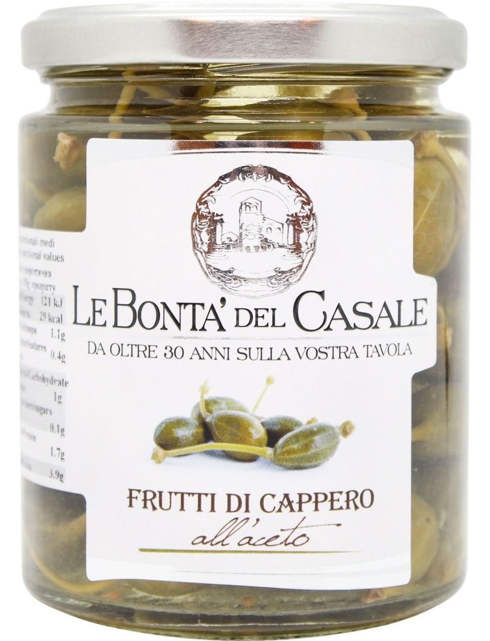 Склад: каперси з ніжкою, вода, винний оцет 5%, сіль, підкислювач: лимонна кислота, антиоксидант: аскорбінова кислота.