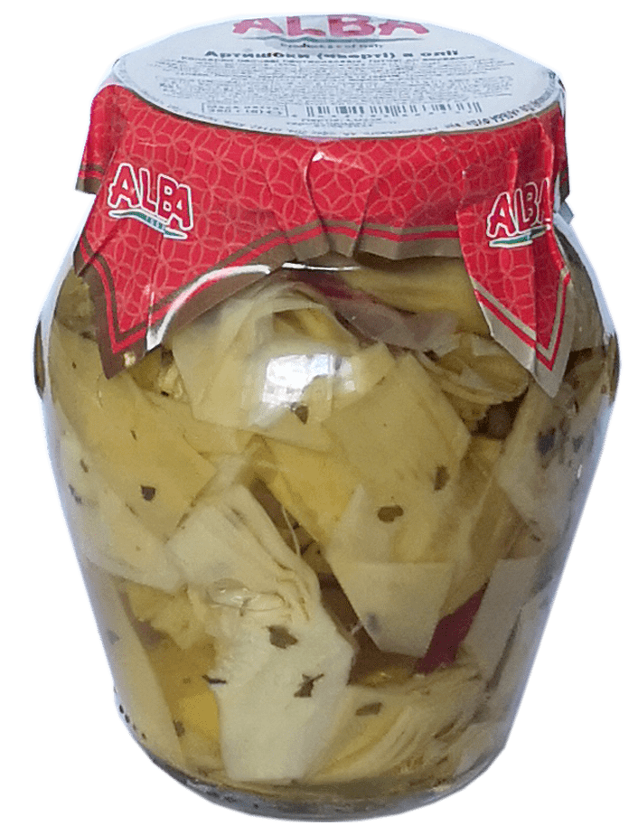 Склад: чверті артишоків (55%), соняшникова олія (37%), оцет, сіль, цукор, перець, оливкова олія першого холодного віджиму, петрушка, часник, перець чилі, базилік, антиоксидант: аскорбінова кислота, регулятор кислотності: лимонна ккислота, підсилювач смаку: глутамат натрію.