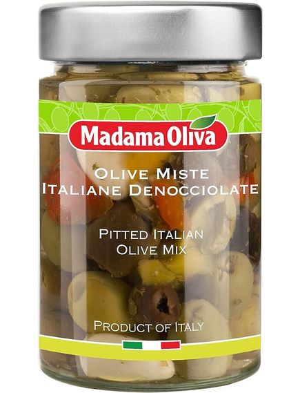 Склад: оливки, соняшникова олія, смужки жовтого та червоного болгарського перцю, зубчики часнику, сіль, спеції, натуральні ароматизатори. Без ГМО. Може містити фрагменти кісточок.