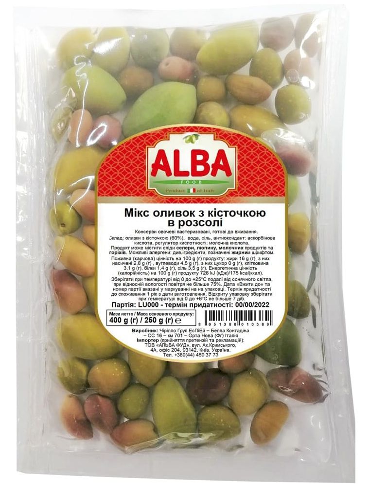Склад: оливки з кісточкою (60%), вода, сіль, антиоксидант: аскорбінова кислота, регулятор кислотності: молочна кислота.