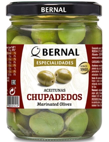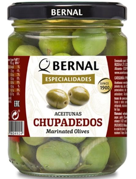 Содова оливка Campo Real інтенсивного зеленого кольору з сорту Okal, з якої ми готуємо в Берналі цей смачний рецепт «Chupadedos», приправлений червоним перцем, часником, орегано та оливковою олією. Його ім'я все говорить.