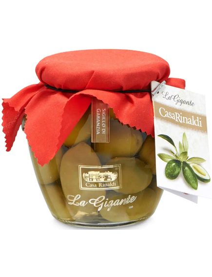 Цей особливий вибір, "le Giganti", містить оливки "La Bella della Daunia DOP", сорт "Bella di Cerignola", як зелені, так і чорні. Це дуже смачні м’ясисті оливки, які характеризуються сільським смаком, компактною та соковитою м’якоттю, вирощені та зібрані виключно в регіоні Cerignola.