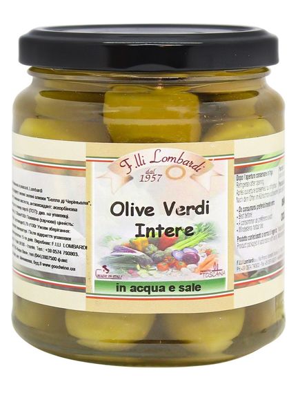Склад: великі зелені оливки Белла ді Черіньйола, вода питна, сіль харчова, регулятор кислотності: лимонна кислота, антиоксиднат: аскорбінова кислота.
