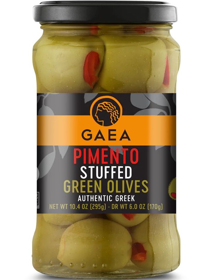 Фаршировані зелені оливки GAEA зі справжнім перцем – це саме те, хрусткі та хрусткі зелені оливки Халкідіки, без кісточок і начинені шматочками справжнього перцю, а не пастою!