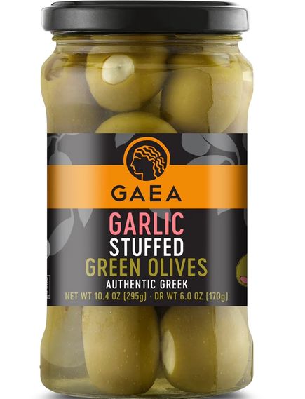 Зелені оливки GAEA, фаршировані цілими зубчиками часнику, — це хрусткі та хрусткі зелені оливки Халкідіки без кісточок, наповнені зубчиками часнику, які чудово підходять для приготування пасти.