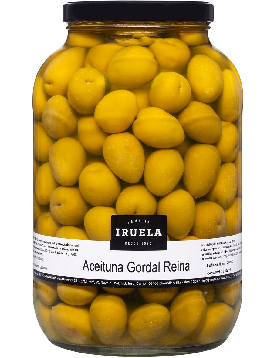 Склад: оливки Гордал, вода, сіль, підсилювач смаку та аромату (Е621, Е631, Е627), регулятори кислотності (Е330, Е270), консерванти (E202, E211) та антиоксидант (Е300).