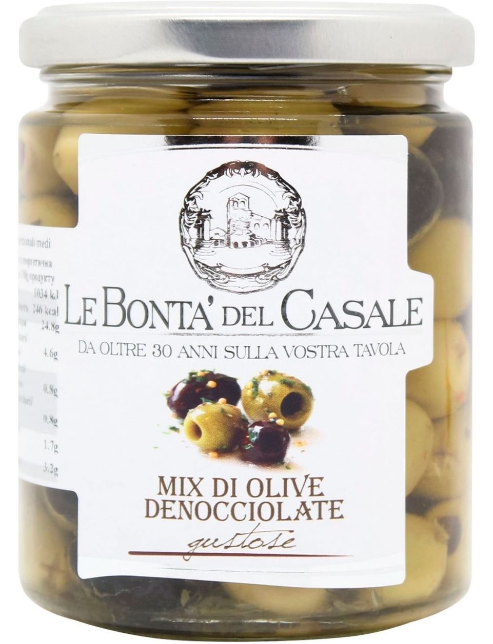 Склад: зелені і чорні оливки в різних пропорціях 59%, соняшникова олія 37%, сіль, ароматичні трави, спеції, регулятор кислотності: молочна кислота, антиоксидант: L-аскорбінова кислота. Може містити фрагменти кісточок.