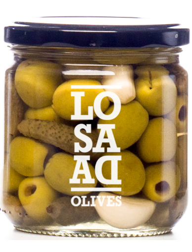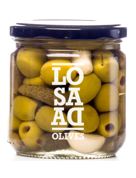 Склад: оливки без кісточок сорту Мансанілья, вода, сіль, часник, корнішони, регулятор кислотності: E330, E270, антиоксидант: E300.