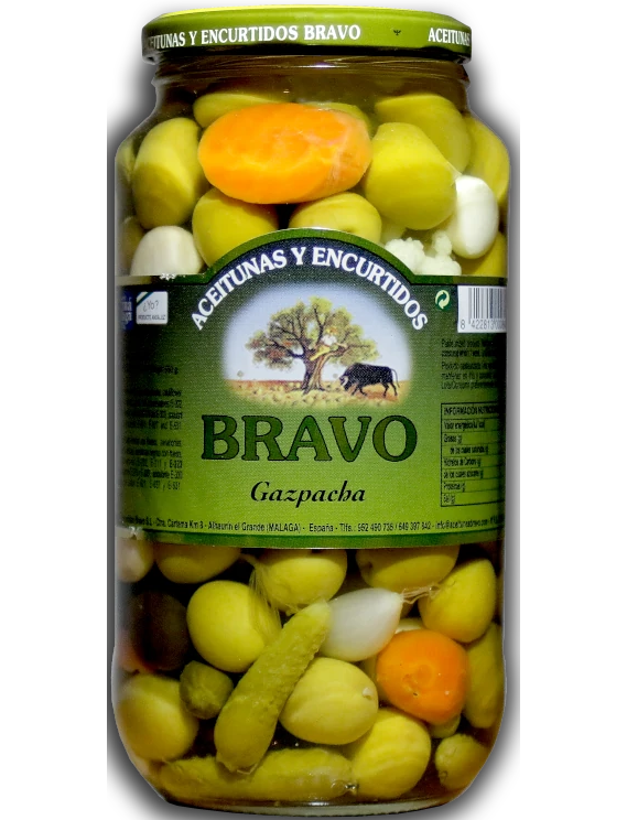 Відкрийте для себе наші вишукані оливки гаспача (коктейль із 7 овочів) – унікальне поєднання оливок та маринованих огірків, яке порадує ваш смак автентичними та традиційними смаками. В Aceitunas Bravo ми пишаємося тим, що пропонуємо високоякісну продукцію, ретельно виготовлену, щоб задовольнити найвибагливіші смаки.