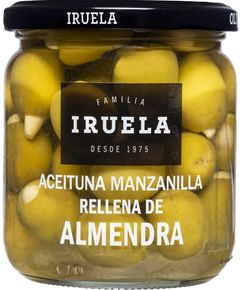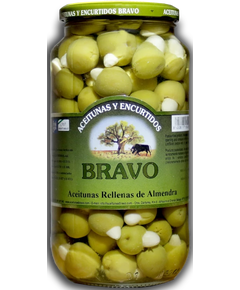 Склад: оливки Мансанілья, мигдаль (10%), вода, сіль, підсилювачі смаку (Е621, Е631, Е627), регулятори кислотності (Е270, Е330), консерванти (Е202, Е211) і антиоксиданти (Е300).