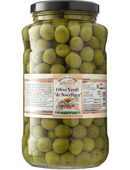 Склад: зелені оливки Ночеллара, вода питна, сіль харчова, регулятор кислотності (лимонна кислота), антиоксидант (аскорбінова кислота). Маса нетто 2,9кг, маса нетто сухого продукту 1,9кг.