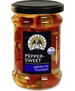 Склад: перець червоний черрі (30%), олія ріпакова (44%), паста з тунця (тунець, анчоуси, трави, спеції, кухонна сіль, каперси (26%), Е412, Е270).