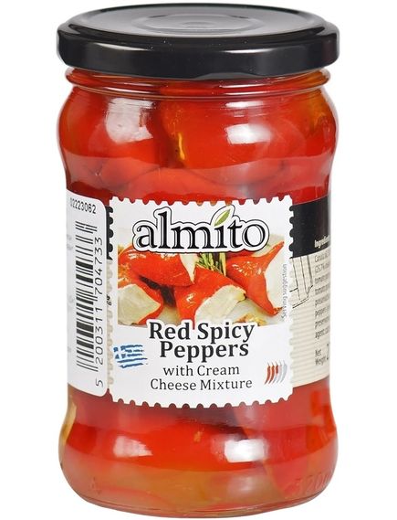 Склад: олія канола, начинка з вершкового сиру 30,5% (вершковий сир, томатне пюре, спеції, сухий сироп глюкози, томатний порошок, крохмаль кукурудзяний, кислота молочна), червоний перець гострий маринований 25% (червоний гострий перець, сіль морська, кислота лимонна, консервант: бензоат натрію, загущувач: хлорид кальцію.