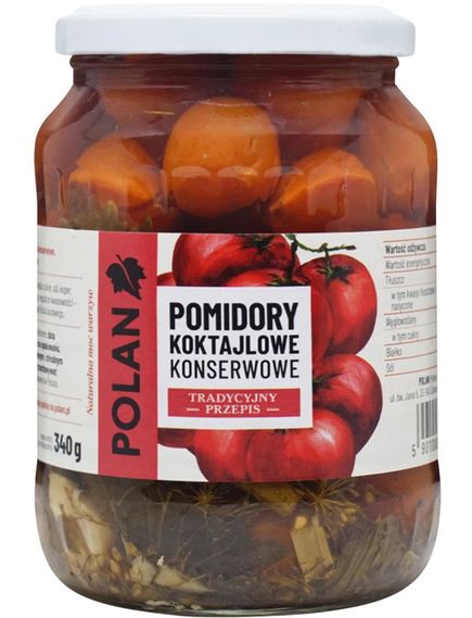 Склад: помідори черрі, вода, цукор, сіль, кріп, лист селери, спеції, регулятор кислотності - кислота лимонна.
