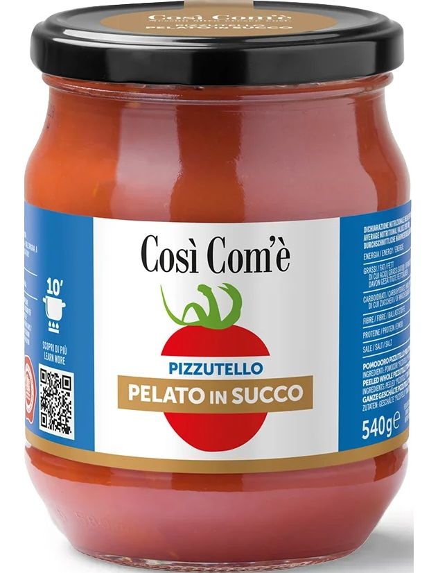 Склад: помідори очищені від шкірки «Pizzutello» (італійського походження з комплексного виробництва), томатний сік.