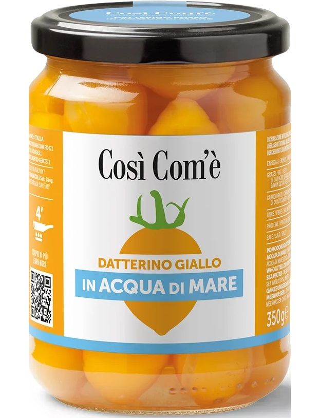 Склад: жовті томати «Даттеріні» (італійського походження з комплексного виробництва), вода морська (20%), вода.